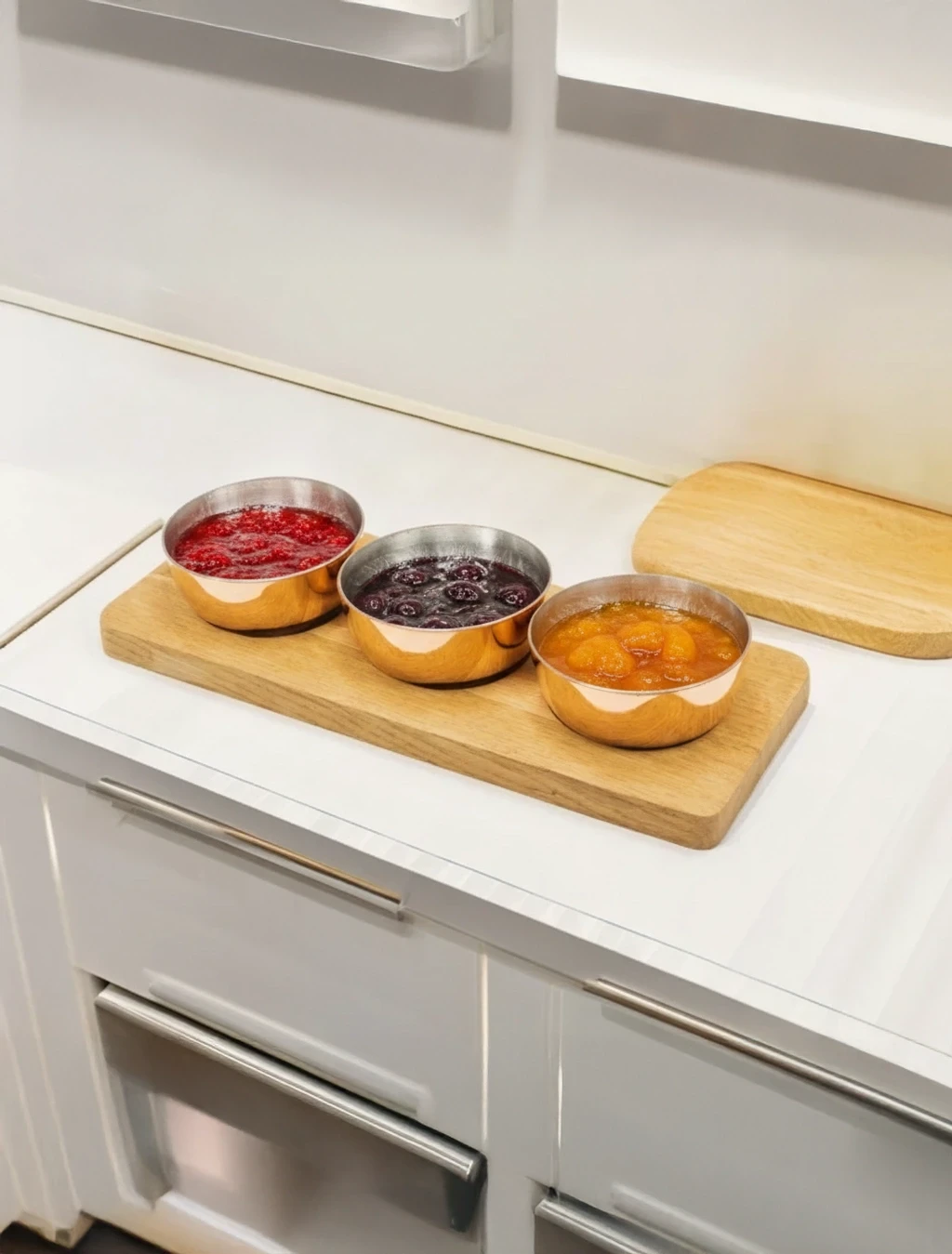 Ahşap Stand: Dayanıklı ve estetik ahşap standlar, bakır soslukların zarif görünümünü tamamlar ve sunumunuza fonksiyonellik katar.
