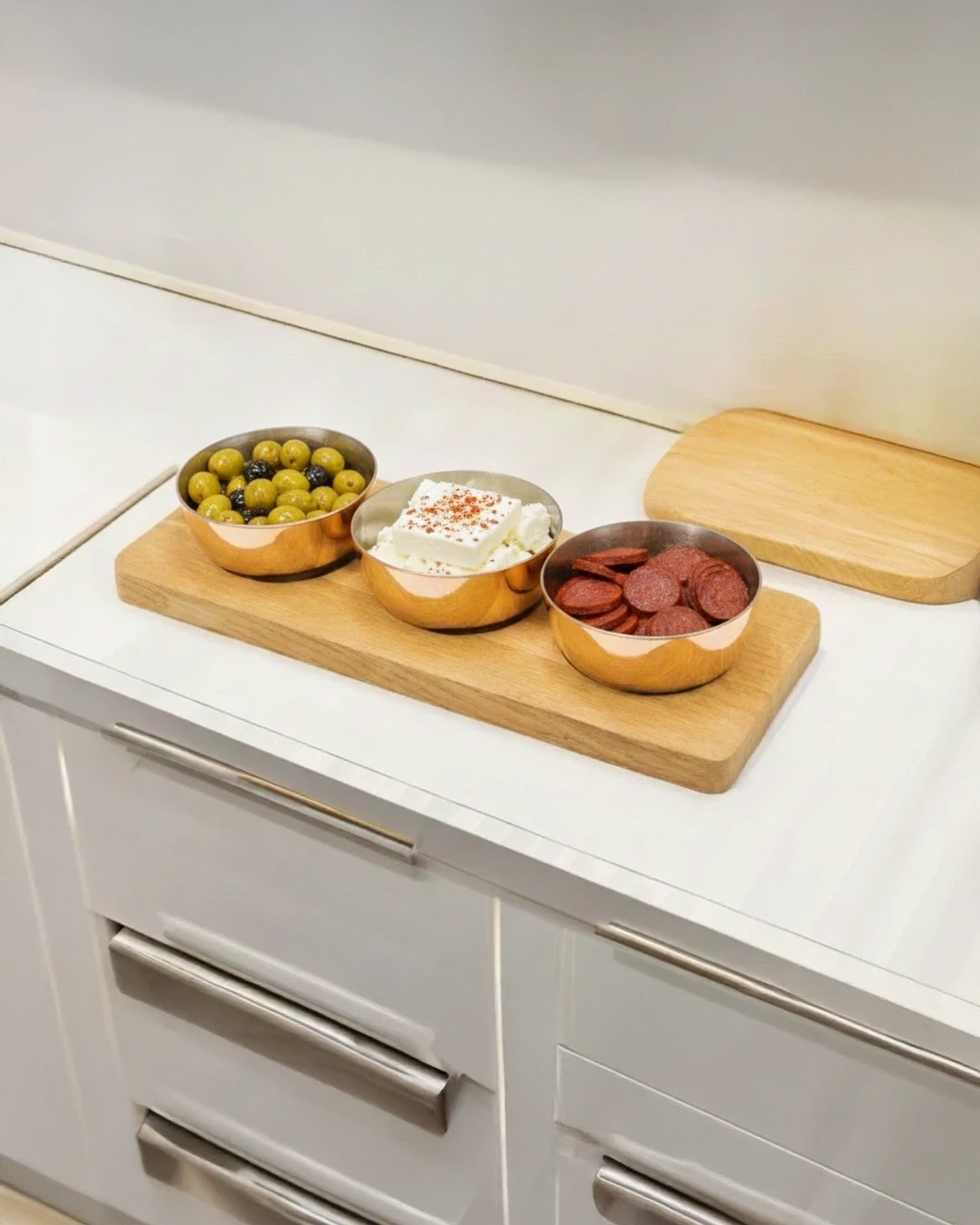 El Yapımı Bakır Sosluk Setleri – Ahşap Standlı Şıklık ve Fonksiyonellik