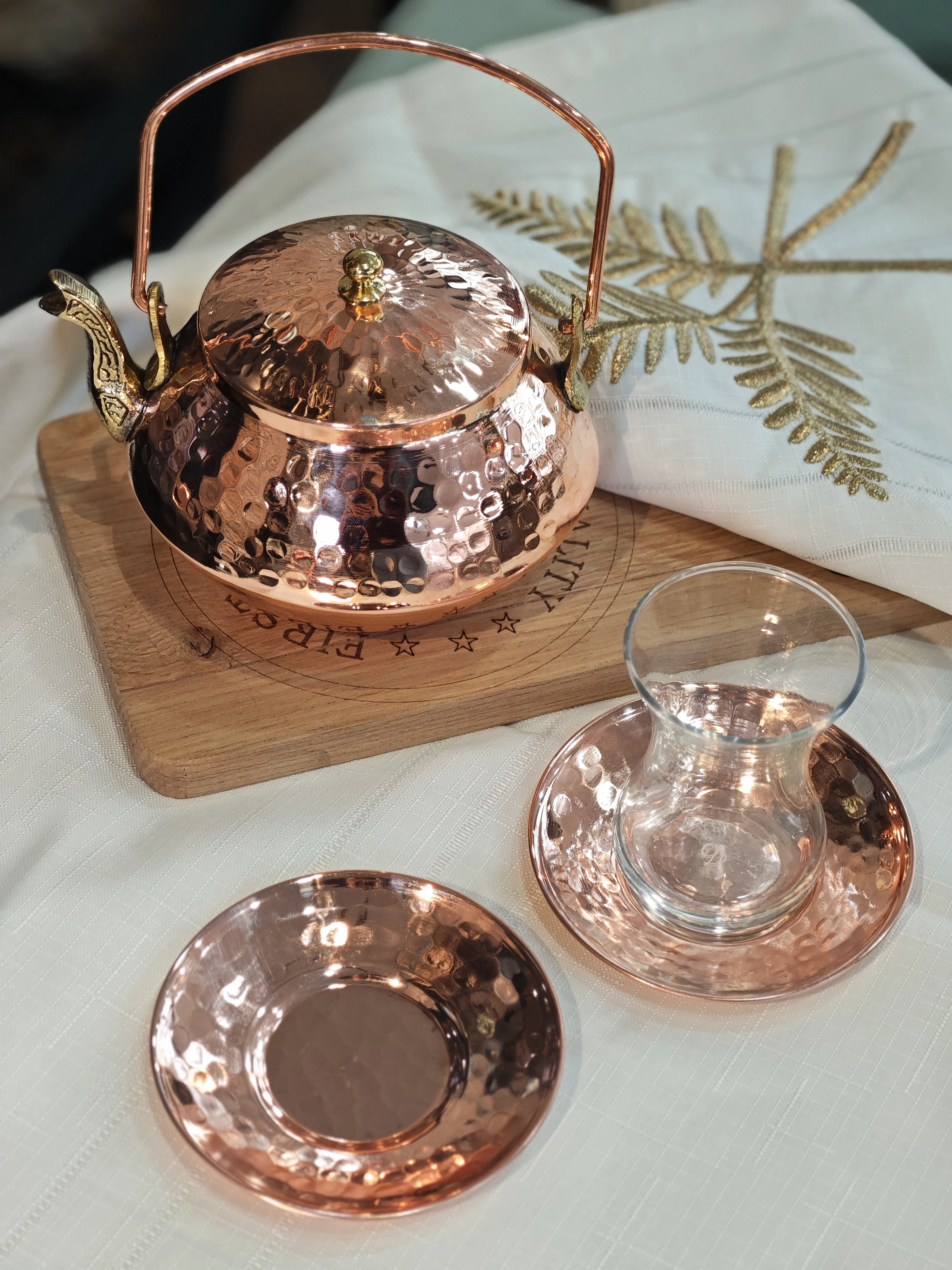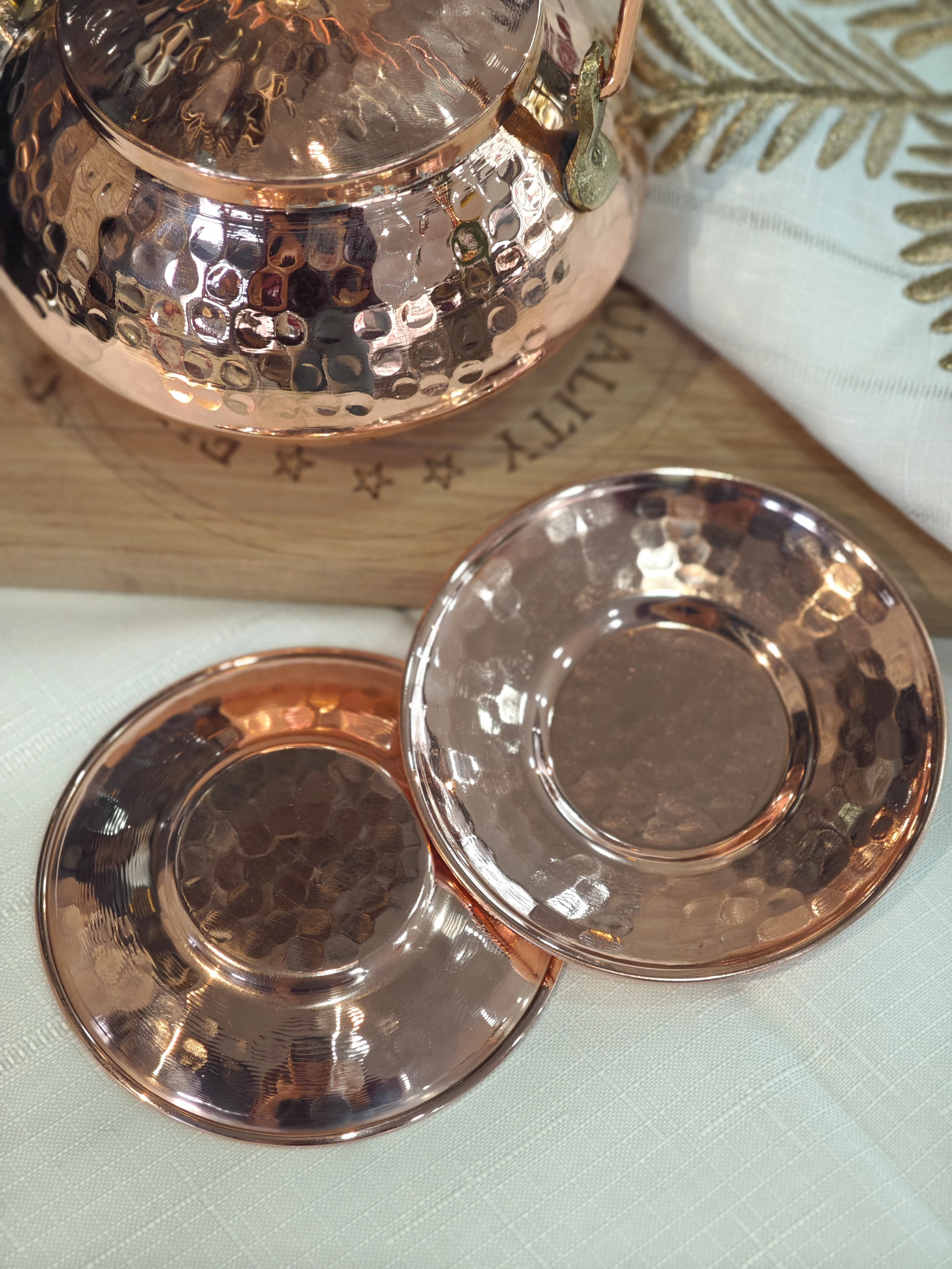 El yapımı bakır çay tabağı, sofralarınıza geleneksel bir dokunuş katarken zarif bir sunum sağlar.