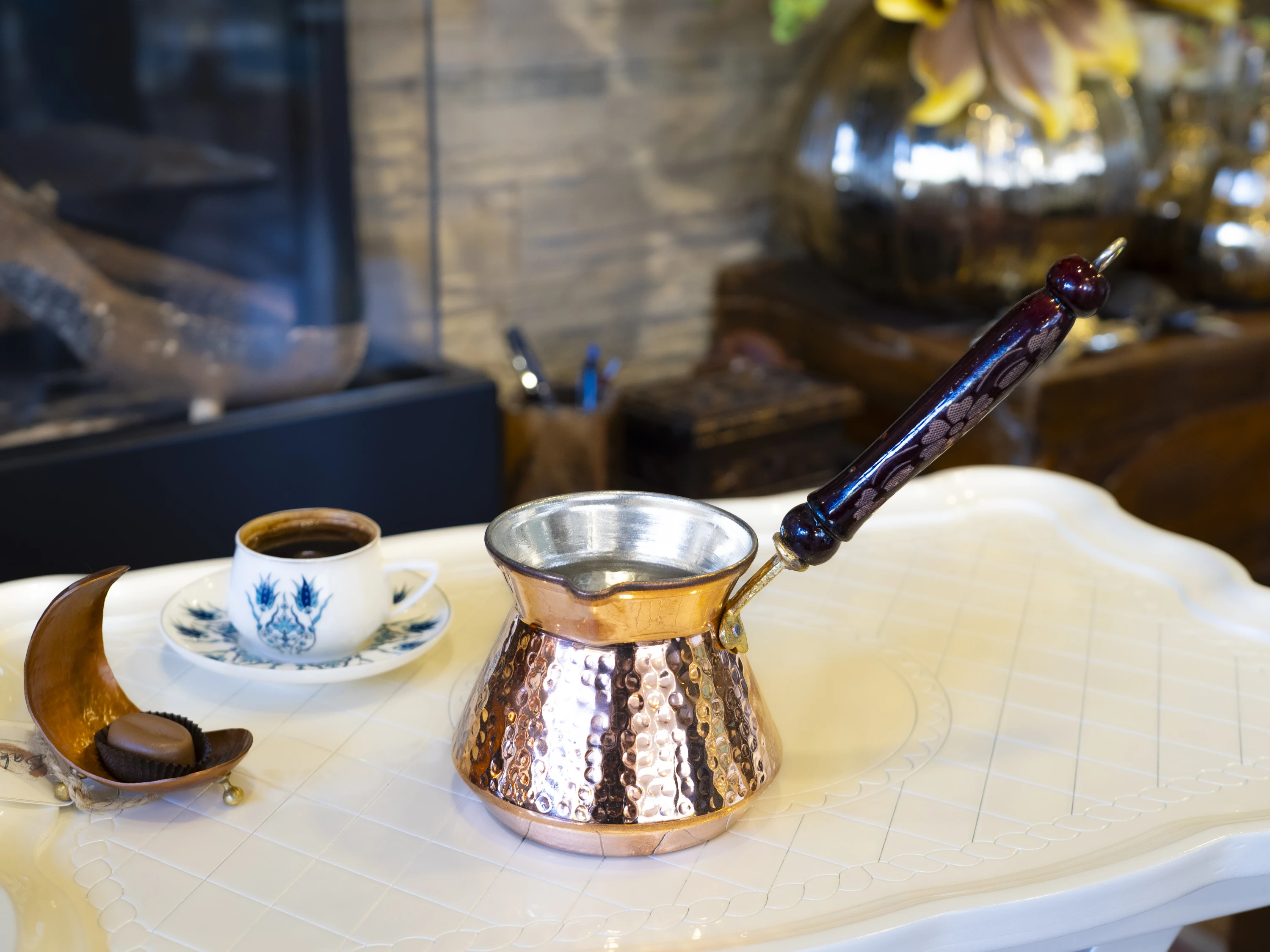 • Bu el yapımı bakır Türk kahvesi cezvesi ile kahve ritüelinizi bir üst seviyeye taşıyın. Yüksek kaliteli kalın ve saf bakırdan ustalıkla şekillendirilmiş olan cezvemiz, eşsiz lezzetler yaratmanıza olanak tanır. Geleneksel yöntemlerle üretilen bu cezve, her fincan Türk kahvesini mükemmel bir şekilde pişirmenizi sağlar.