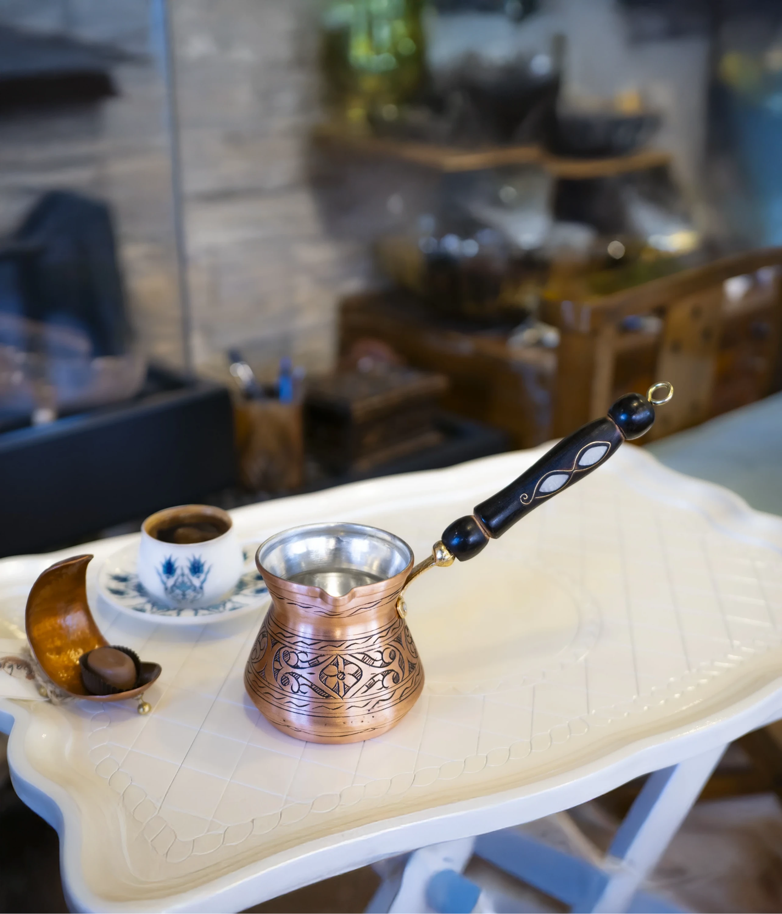 Her bir cezve, geleneksel yöntemlerle ve büyük bir özenle elde şekillendirilmiştir, bu da her birinin eşsiz bir hikayesi ve karakteri olmasını sağlar.