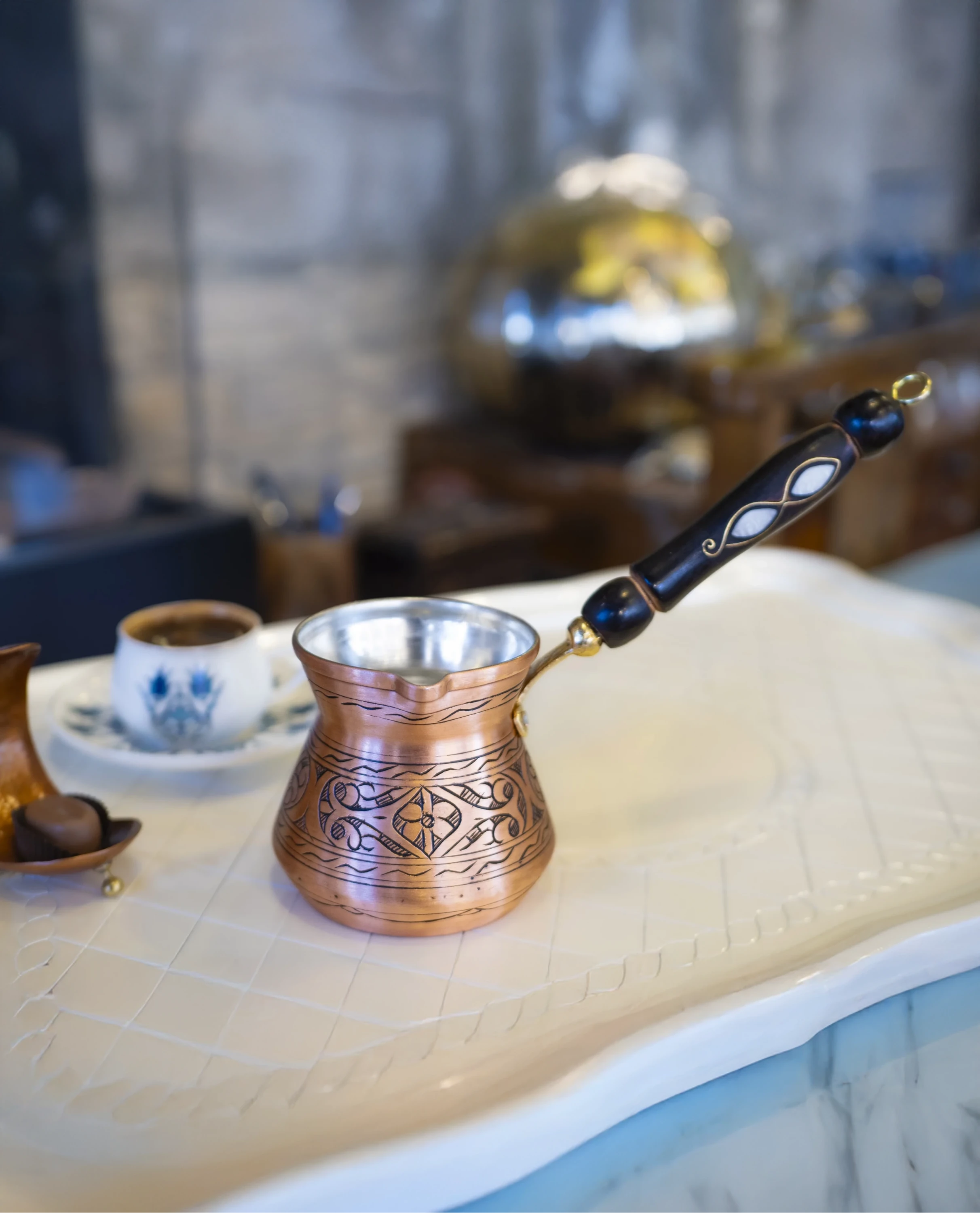 • Bu el yapımı bakır Türk kahvesi cezvesi ile kahve ritüelinizi bir üst seviyeye taşıyın. Yüksek kaliteli kalın ve saf bakırdan ustalıkla şekillendirilmiş olan cezvemiz, eşsiz lezzetler yaratmanıza olanak tanır. Geleneksel yöntemlerle üretilen bu cezve, her fincan Türk kahvesini mükemmel bir şekilde pişirmenizi sağlar.