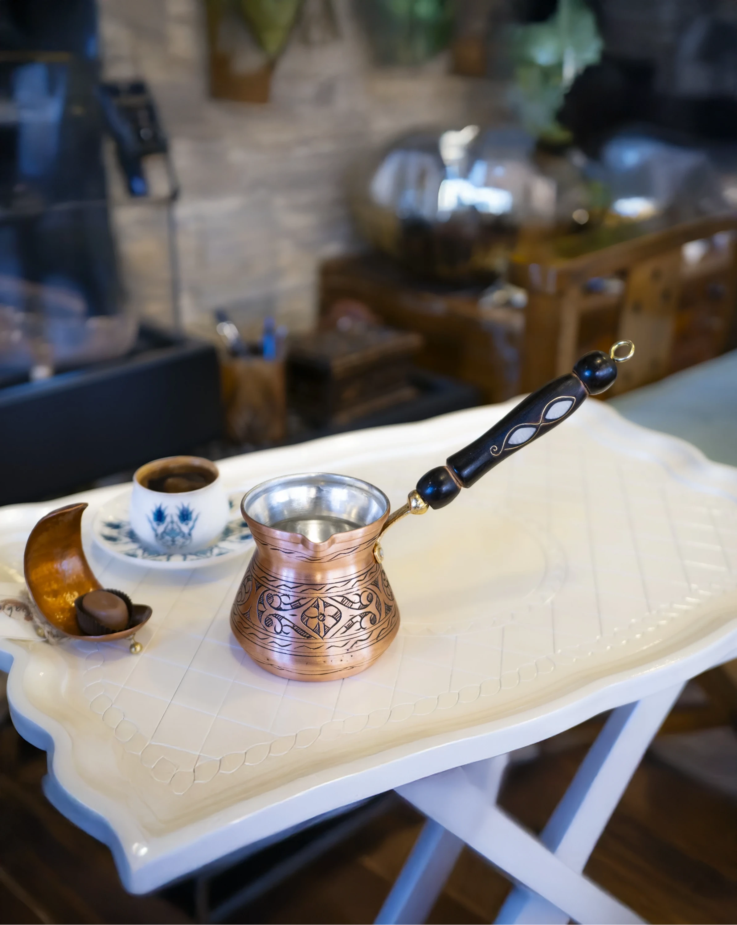 Her bir cezve, geleneksel yöntemlerle ve büyük bir özenle elde şekillendirilmiştir, bu da her birinin eşsiz bir hikayesi ve karakteri olmasını sağlar.