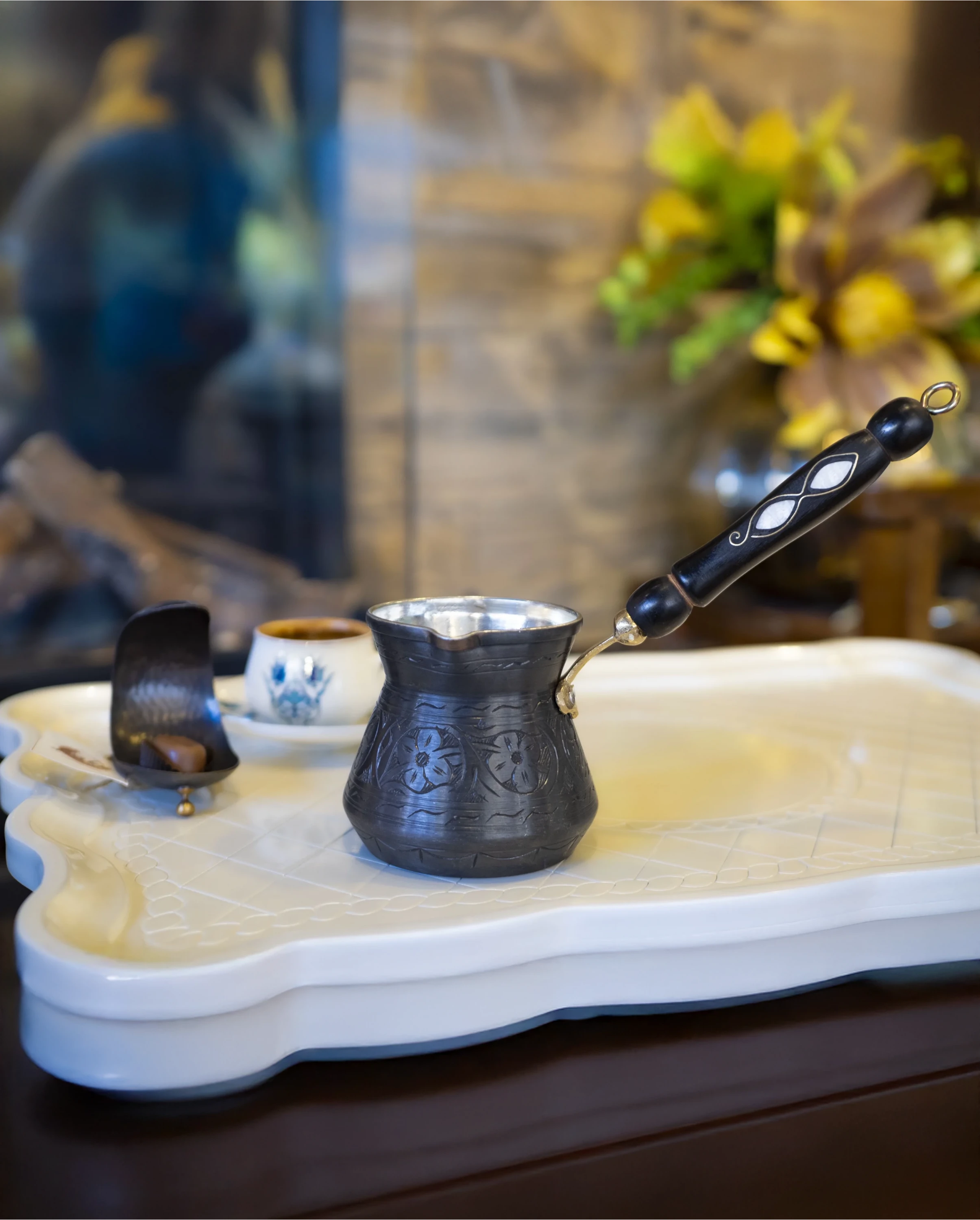 • Her bir cezve, geleneksel yöntemlerle ve büyük bir özenle elde şekillendirilmiştir, bu da her birinin eşsiz bir hikayesi ve karakteri olmasını sağlar.