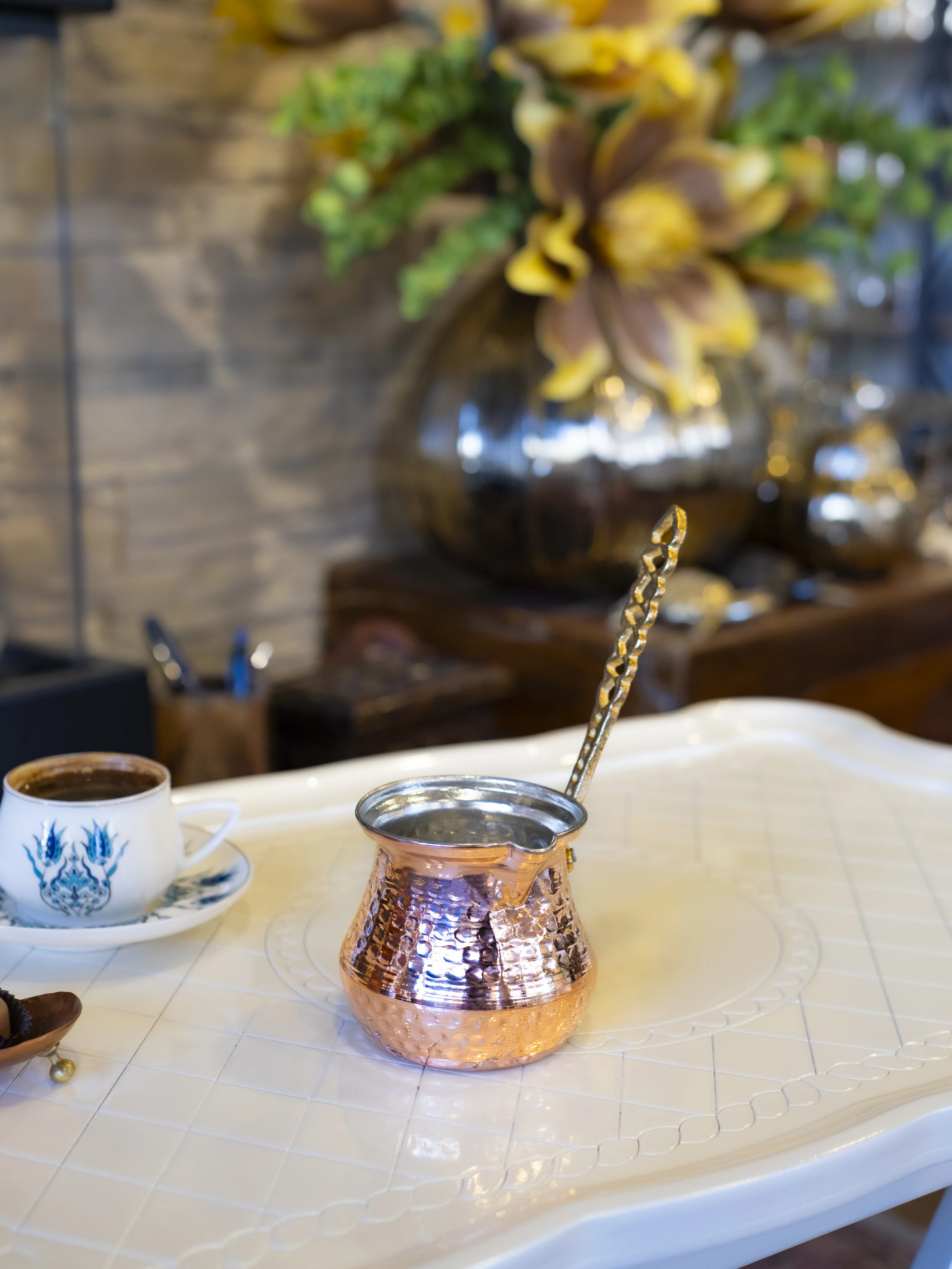 Bu el yapımı bakır Türk kahvesi cezvesi ile kahve ritüelinizi bir üst seviyeye taşıyın. Yüksek kaliteli kalın ve saf bakırdan ustalıkla şekillendirilmiş olan cezvemiz, eşsiz lezzetler yaratmanıza olanak tanır. Geleneksel yöntemlerle üretilen bu cezve, her fincan Türk kahvesini mükemmel bir şekilde pişirmenizi sağlar.