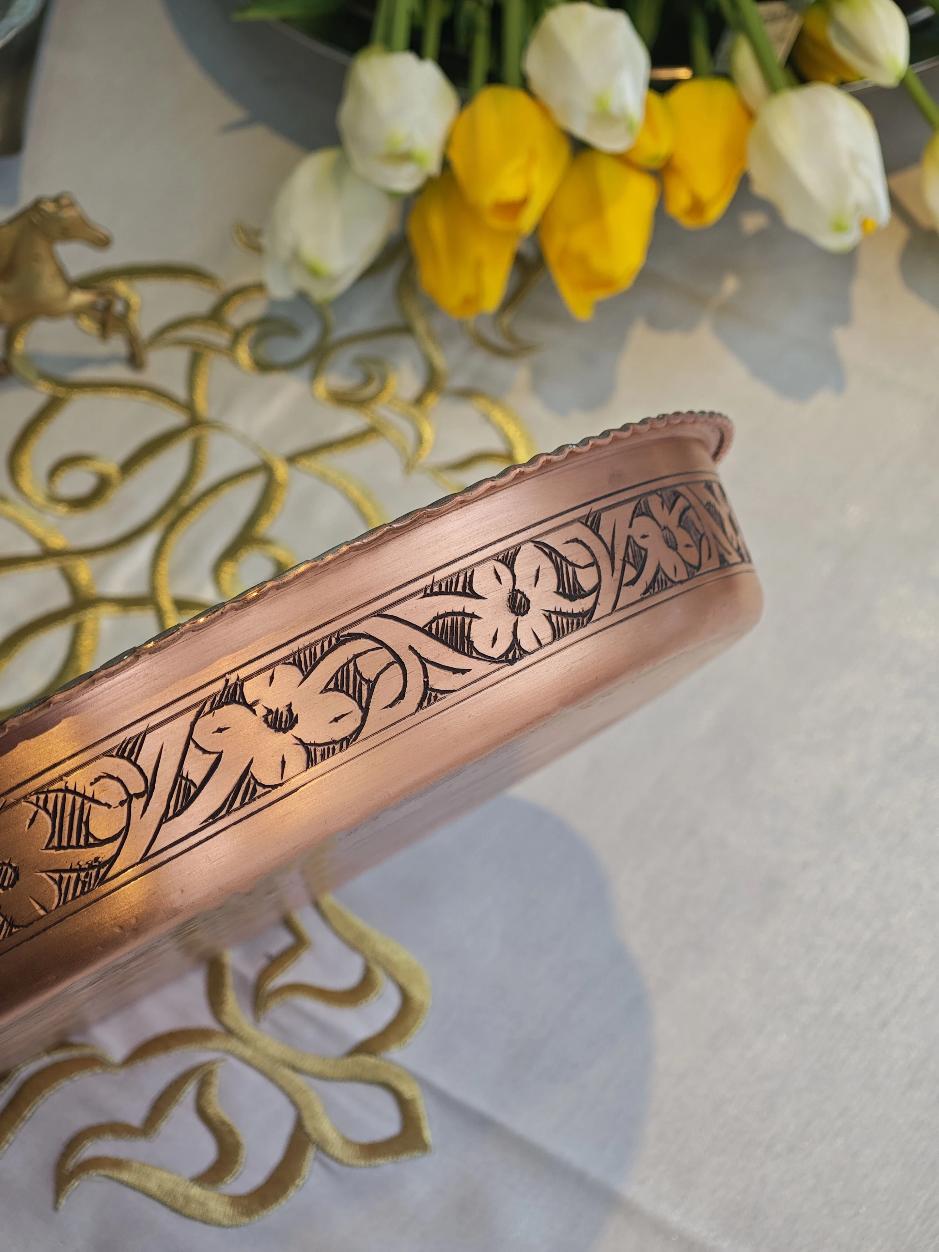 Mutfak deneyiminizi geleneksel bir dokunuşla güncelleyin! El yapımı bakır fırın tepsisi, ev yapımı lezzetlerinizi pişirirken hem göz alıcı bir şıklık sunar hem de yemeklerinizi mükemmel şekilde pişirir.