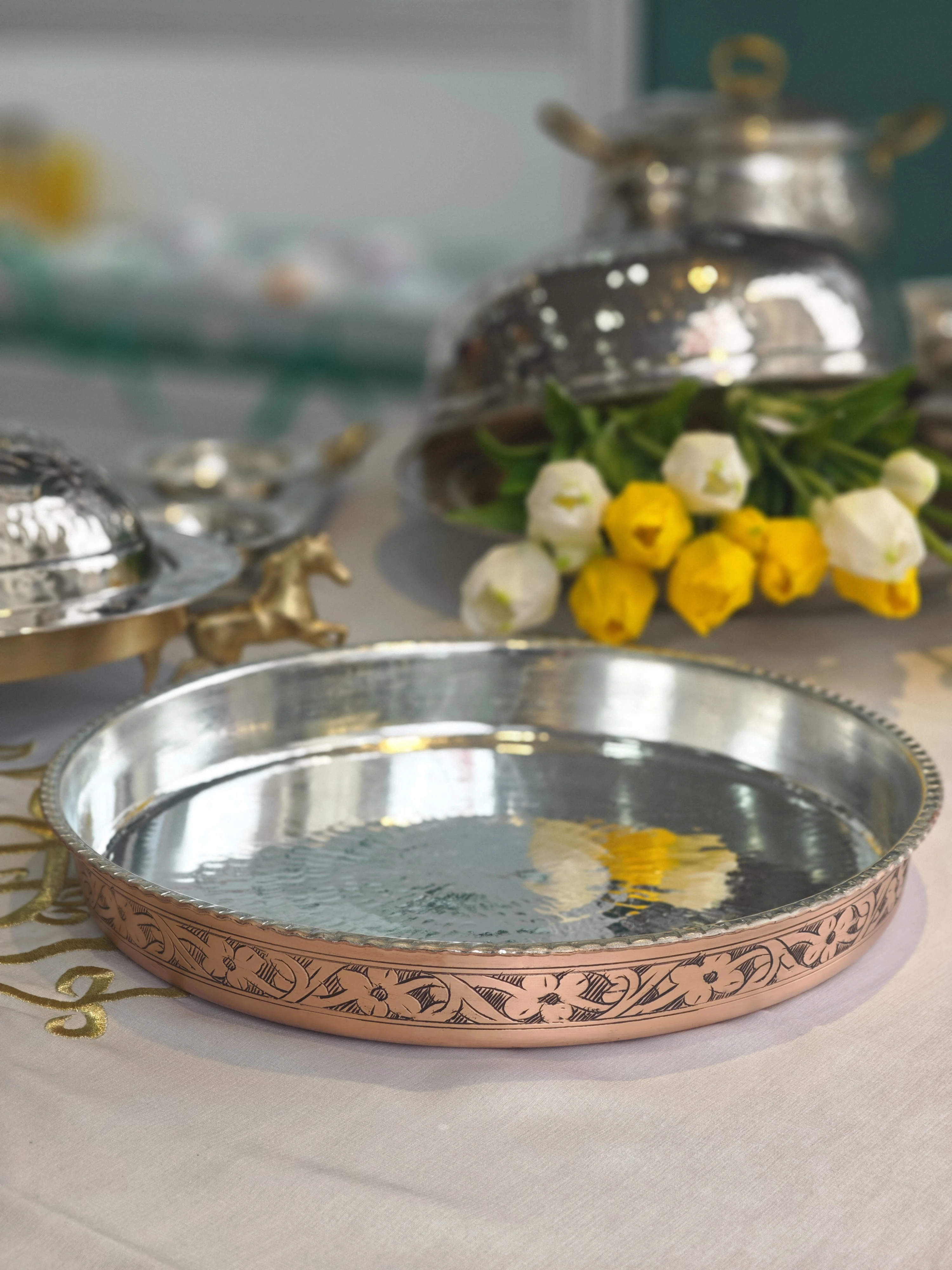 Her biri ustalıkla işlenmiş olan bu bakır fırın tepsisi, mutfak dekorunuza zarif bir dokunuş katarken aynı zamanda misafirlerinizin dikkatini çeker. Geleneksel ve modern tarzı bir araya getirerek benzersiz bir estetik sunar.