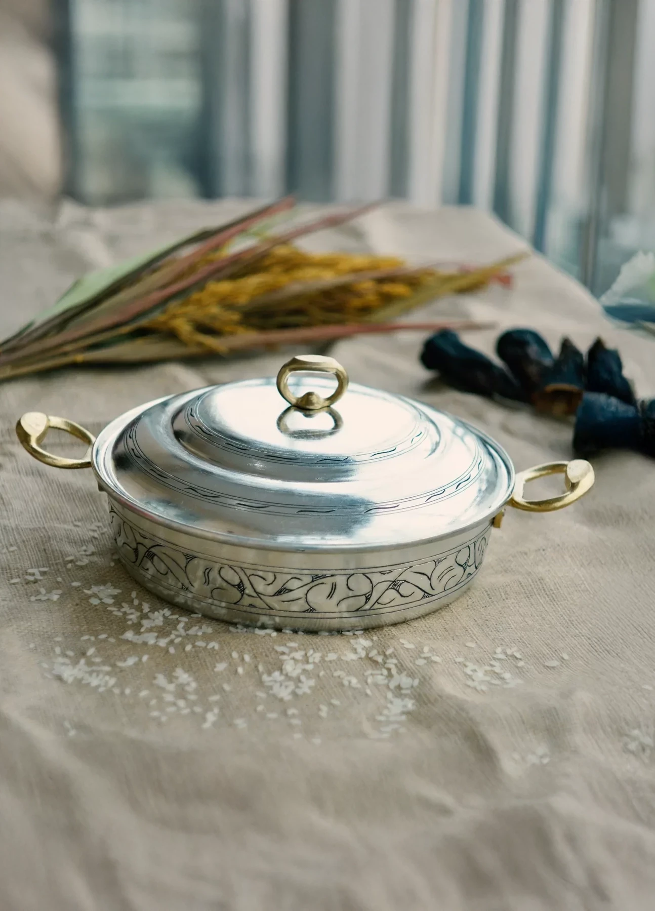 BAKIR TENCERE OYMA NAKIŞ İŞLEME ENGİN MODEL GÜMÜŞ RENK 25CM