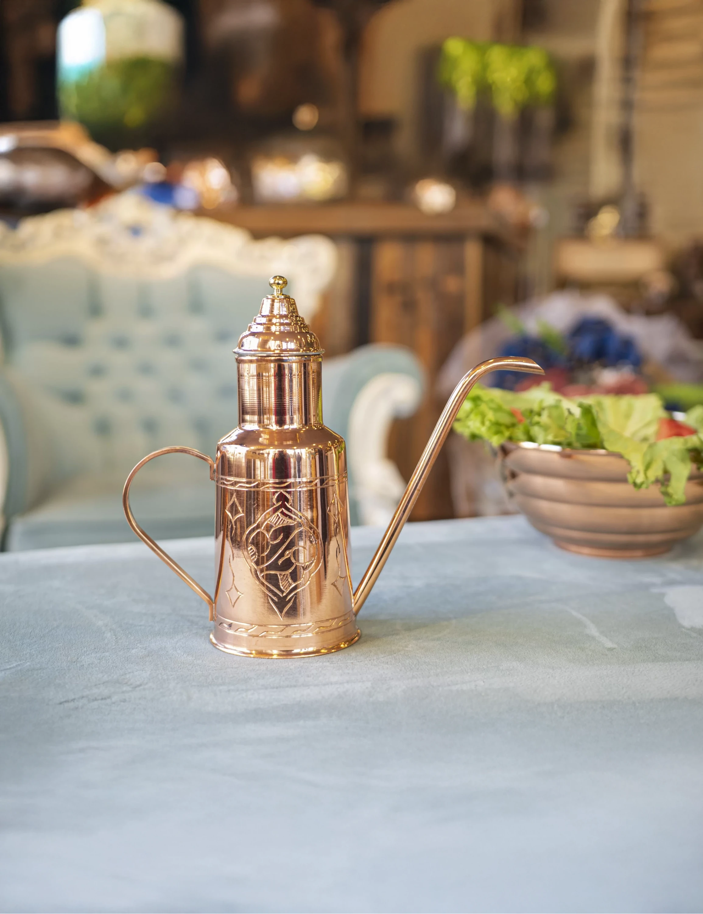 • %100 saf bakırdan elde edilen bu yağdanlık, gıdalarınızın doğal lezzetini ve besin değerini korur. Geleneksel bakırın anti-bakteriyel özellikleriyle donatılmıştır,