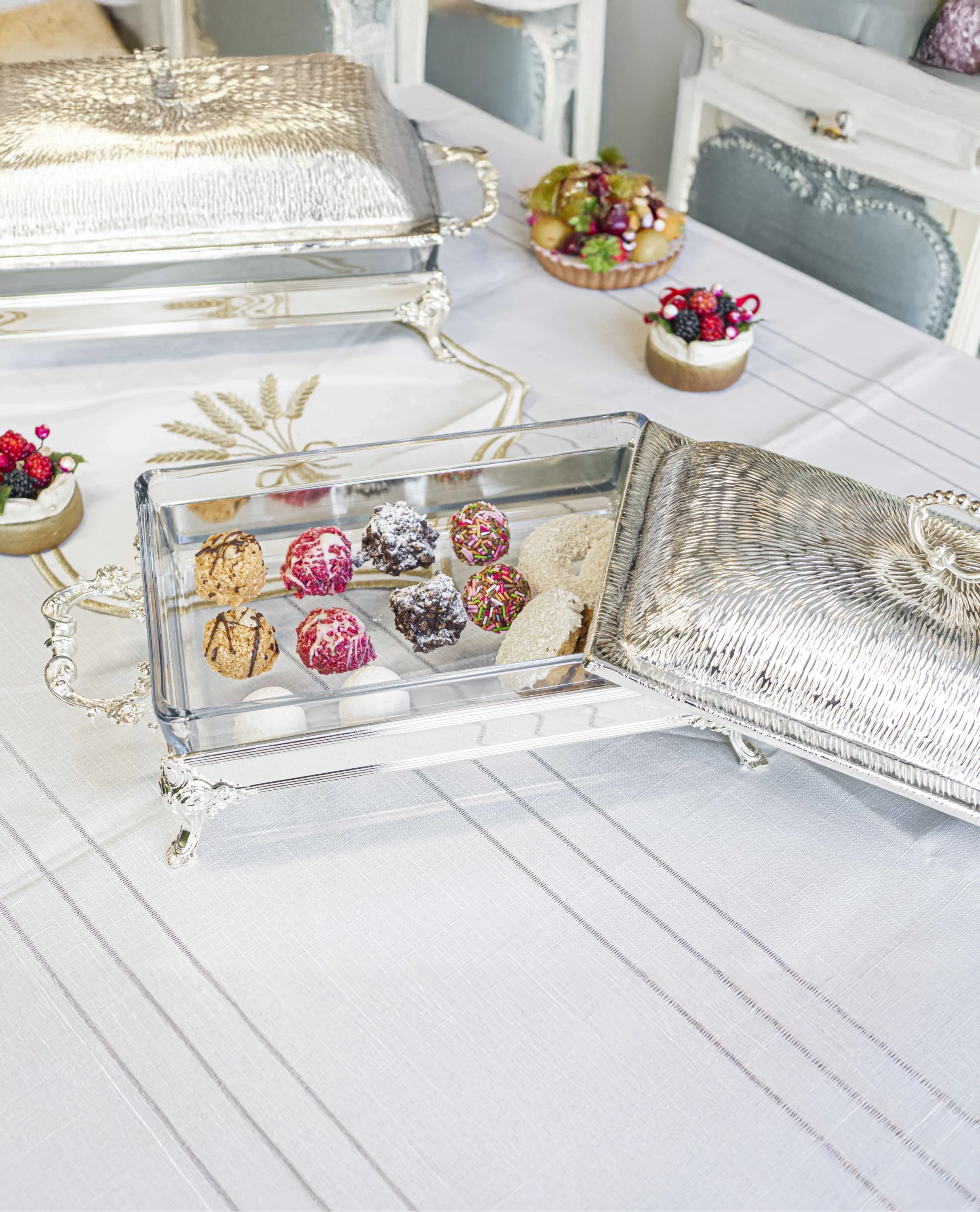 Pirinç üzeri gümüş kaplama sunum ürünlerimiz, sofralarınıza sofistike bir dokunuş katarken, aynı zamanda özel anlarınıza unutulmaz bir atmosfer sunmak için ideal bir seçenektir. En özel anlarınızı şıklık ve zarafetle taçlandırmak için bu ürünlerimiz sizleri bekliyor.